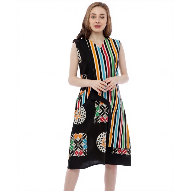 Dress terbuat dari batik cap motif piring selampat multi color kombinasi motif slarak di bagian depan