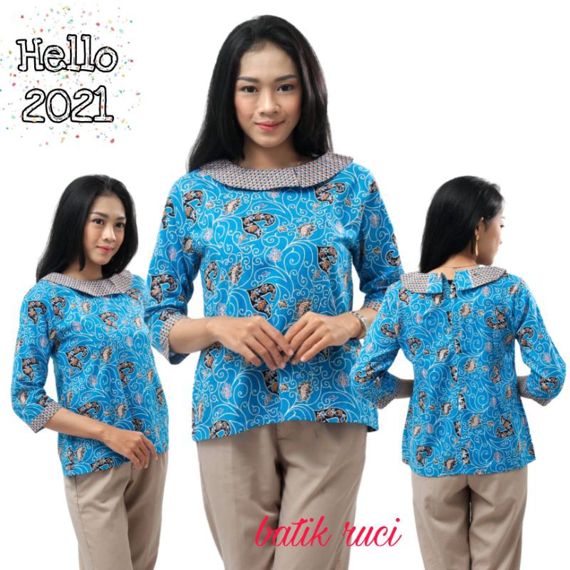 Distributor Pakaian W di Kabupaten Buol Atasan Batik Wanita Blouse Berkerah Besar Waran Biru Size S-m-l-xl-xxl-3l-4l-5l dari Tidak Ada Merek Kota Pekalongan